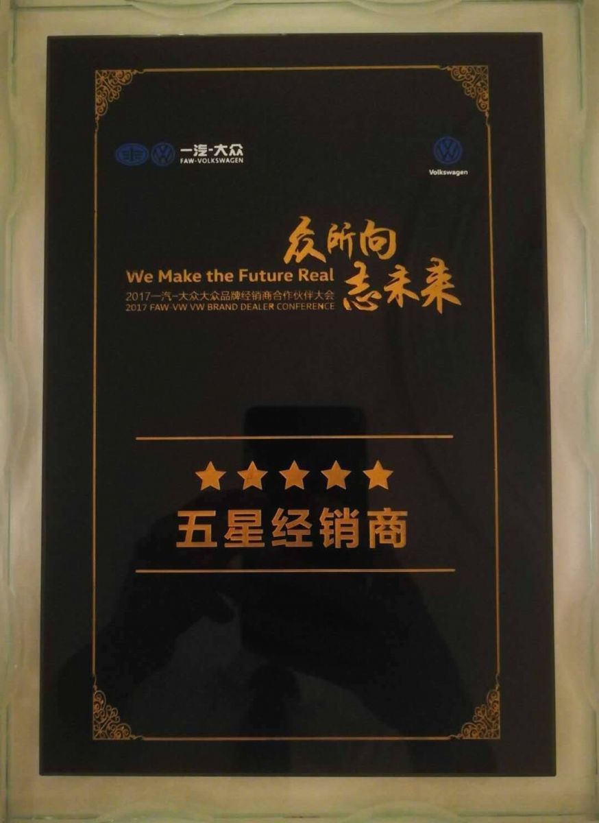 在隨后的頒獎典禮上,一汽-大眾對大眾品牌2017年度的卓越經銷商進行了表彰。盈眾汽車榮獲“功勛經銷商集團”、“五星經銷商”等多項組織及個人大獎。其中,“五星經銷商”稱號是一汽-大眾對經銷商的最高榮譽。獲此獎項意味著,經銷商在新車銷售量、售后服務臺次、市場營銷推廣、客戶滿意度、廠方DCA檢查、售后AuditⅡ檢查等諸多方面均名列全國前列。