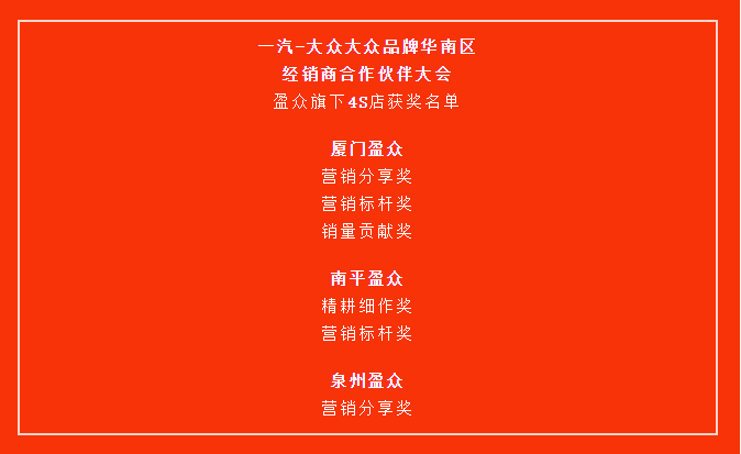 會上,大眾品牌·華南區(qū)銷售事業(yè)部表彰2018年表現(xiàn)優(yōu)異的經(jīng)銷商,盈眾旗下多家一汽-大眾4S店上榜。