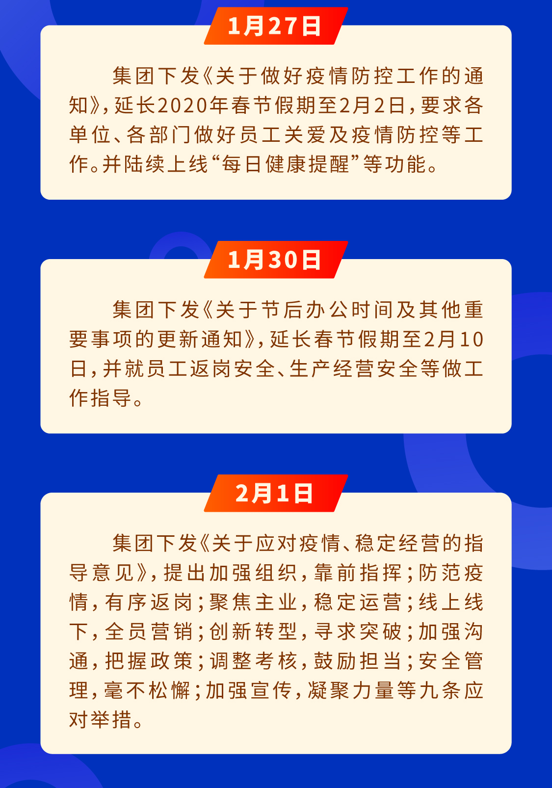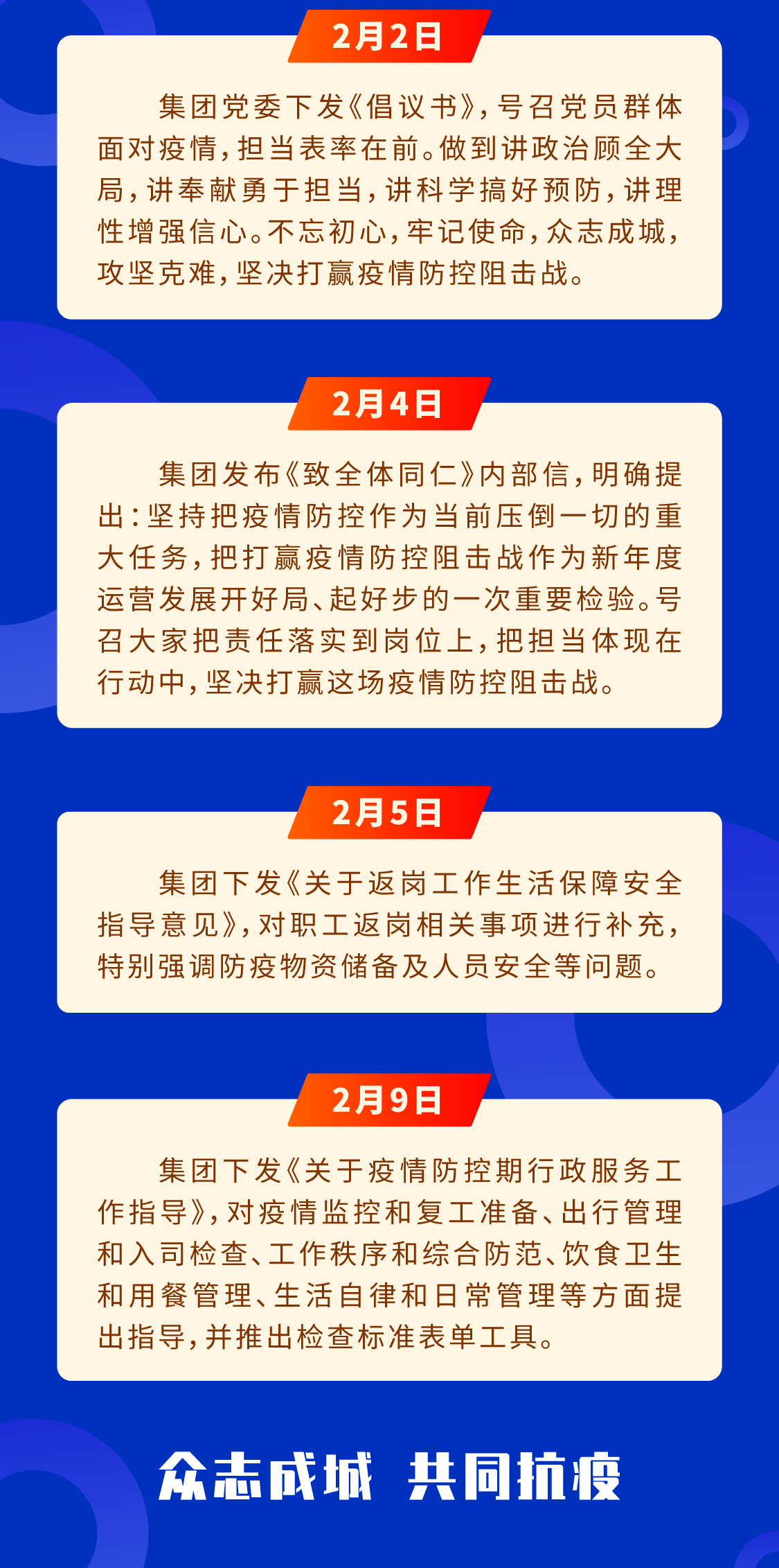 張總多次對工作小組強調:“疫情防控最重要是優先確保員工和客戶的平安健康”。陳主任表示,基層一線是對外服務的窗口,是防控工作重中之重,集團全體同仁多一分擔當,員工的安全就多一分保障,我們的客戶和家人就多一分安康。