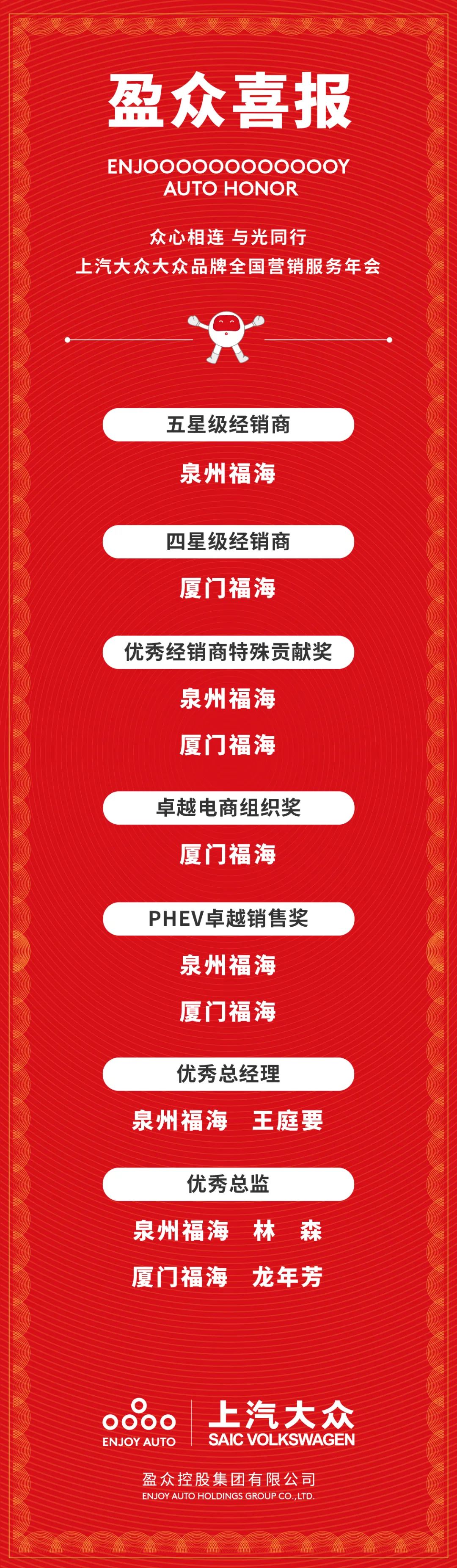 年會上,盈眾上汽大眾團隊榮獲“五星級經銷商”“優秀經銷商特殊貢獻獎”等多項榮譽,其中泉州福海連續七年蟬聯“五星級經銷商”榮譽,“卓越電商組織獎”“PHEV卓越銷售獎”也體現了盈眾上汽大眾團隊緊跟市場發展,創新營銷服務,以及在新能源汽車銷售服務方面的實力。