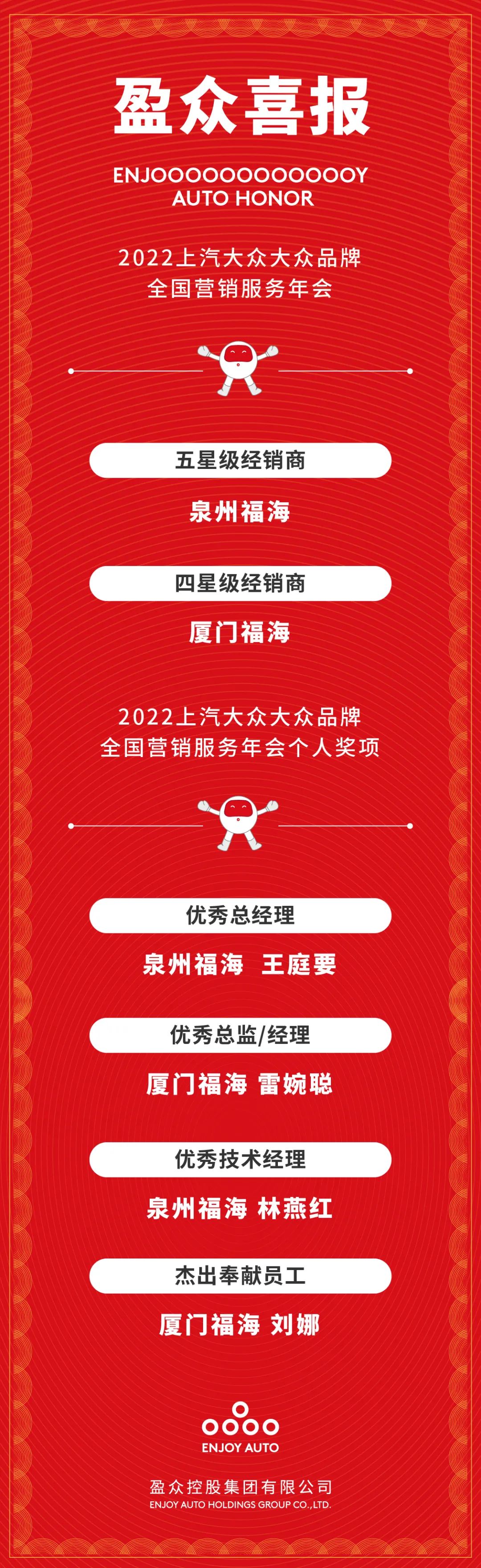 在今天上午召開的“2022上汽大眾大眾品牌全國營銷服務年會”上,2021年度全國優(yōu)秀經銷商及個人獲獎名單新鮮出爐。盈眾上汽大眾團隊憑借在銷售、服務、客戶滿意度、運營管理等多方面的優(yōu)秀表現(xiàn),榮獲五星級經銷商等多項榮譽。