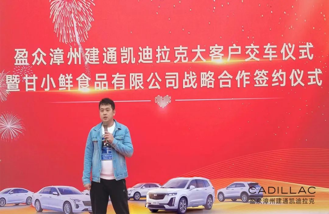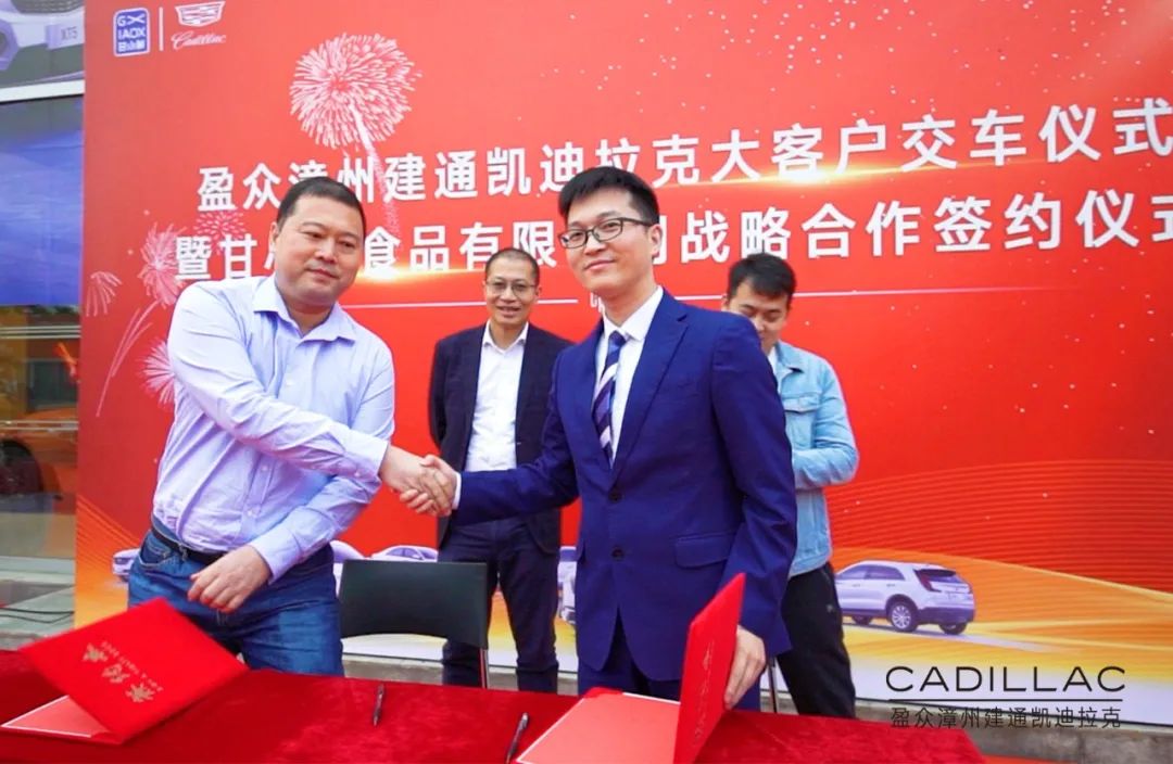 在到場人士的共同見證下,盈眾漳州建通凱迪拉克總經(jīng)理曾蛟龍與甘小鮮(福建)食品有限公司總經(jīng)理??徍炇鹆藨?zhàn)略合作協(xié)議,并現(xiàn)場完成首批八臺凱迪拉克交車儀式。