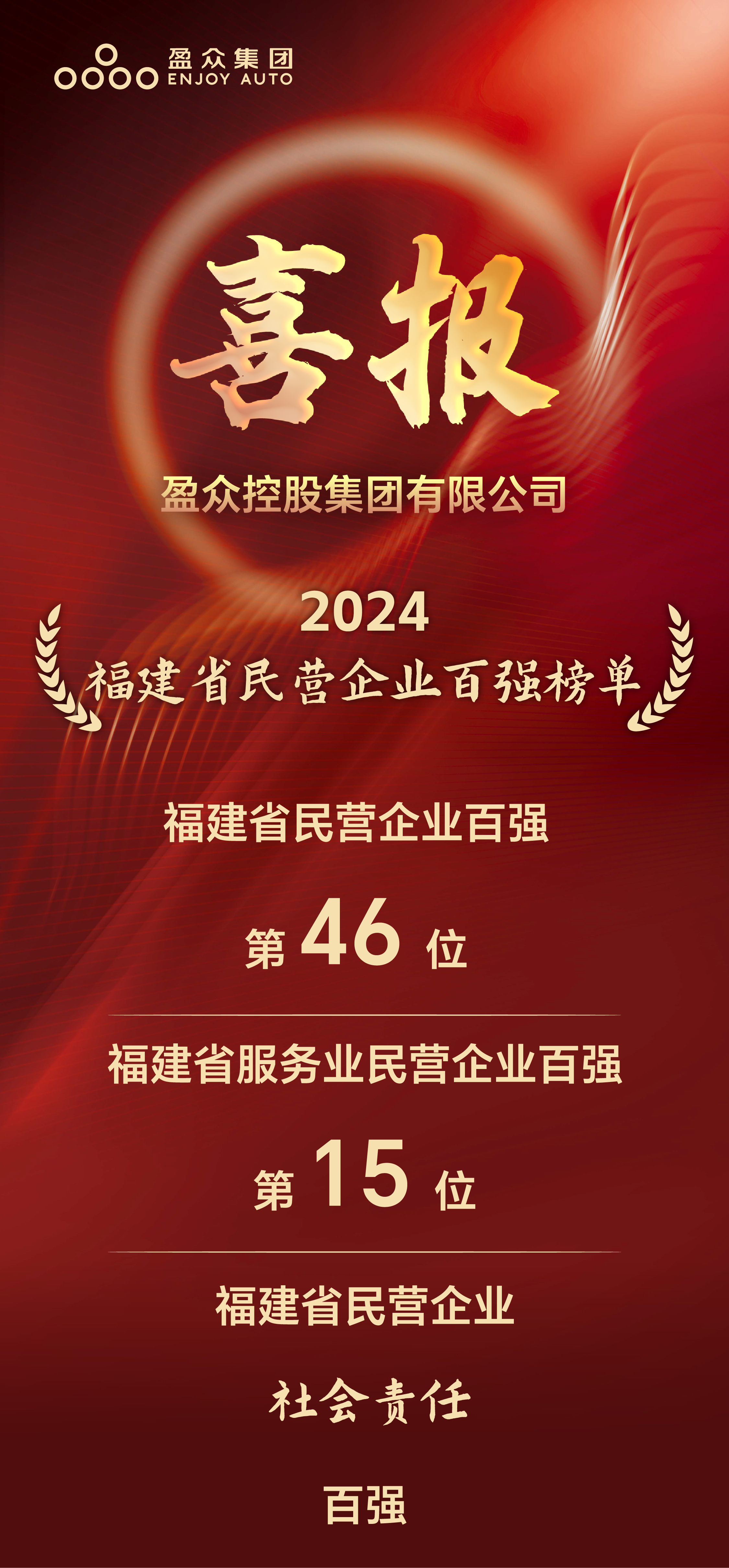 9月19日,福建省工商聯(lián)權(quán)威發(fā)布2024年度福建省民營企業(yè)百強榜單,包括2024福建省民營企業(yè)100強、服務(wù)業(yè)民營企業(yè)100強和福建省民營企業(yè)社會責(zé)任100佳。盈眾集團以優(yōu)異表現(xiàn)榮登榜單,位列福建省民營企業(yè)100強第46位,福建省服務(wù)業(yè)民營企業(yè)100強第15位,同時,盈眾控股集團還入圍“福建省民營企業(yè)社會責(zé)任100佳”。
