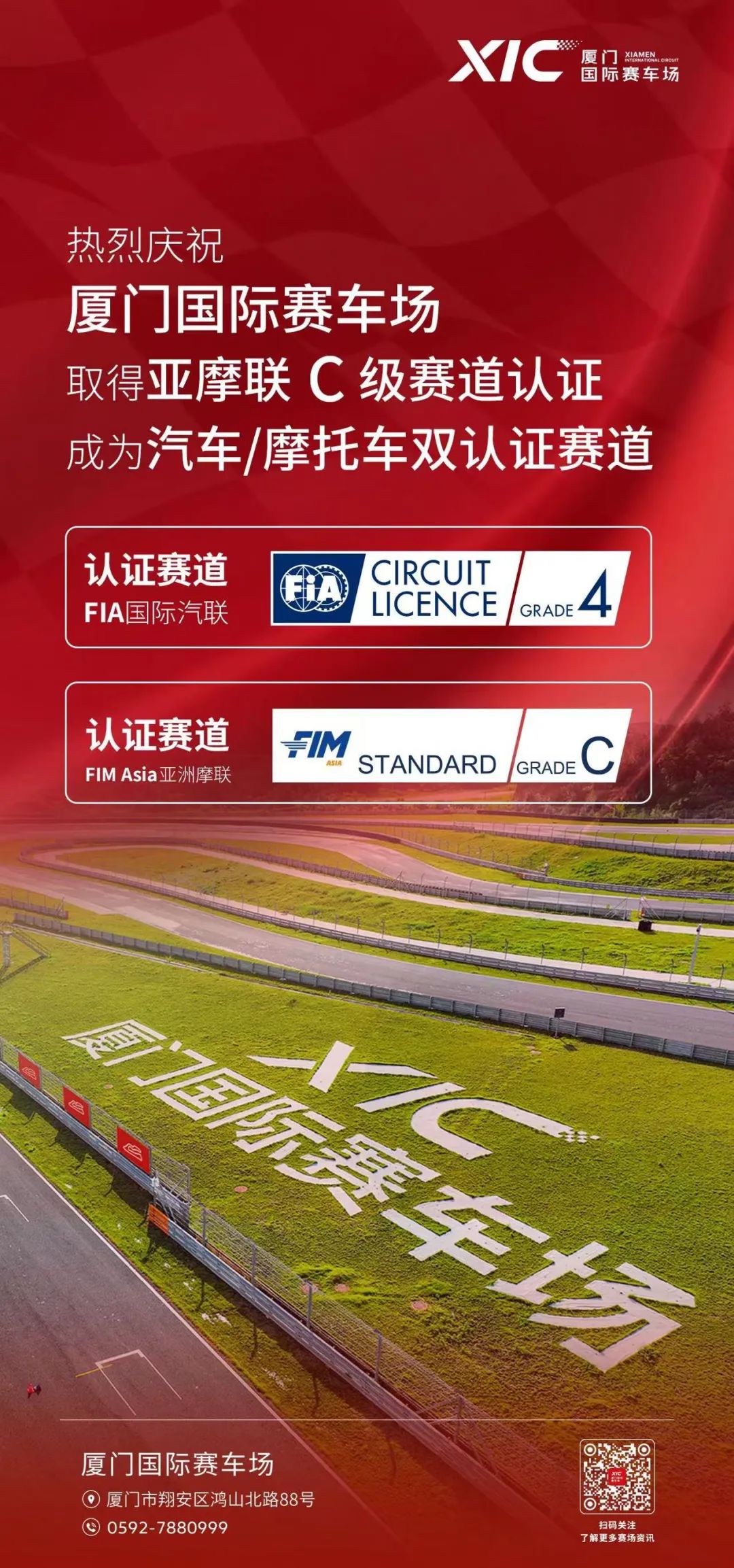 廈門國際賽車場是福建省第一個國際賽車場,也是兩岸賽車文化交流和聯合賽事舉辦的重要平臺。于2021年7月通過國際汽聯(FIA)的四級賽道認證,2025年1月通過亞洲摩聯(FIM ASIA)的C級賽道認證。賽道全長1.82公里,共有13個彎道,具有極強的操控性和體驗感。賽道另配備11000㎡賽事大樓、15000㎡瀝青賽事廣場等。已成為海峽西岸廣大汽車愛好者感受“速度與激情”、零距離參與汽車、摩托車運動的最佳主場。