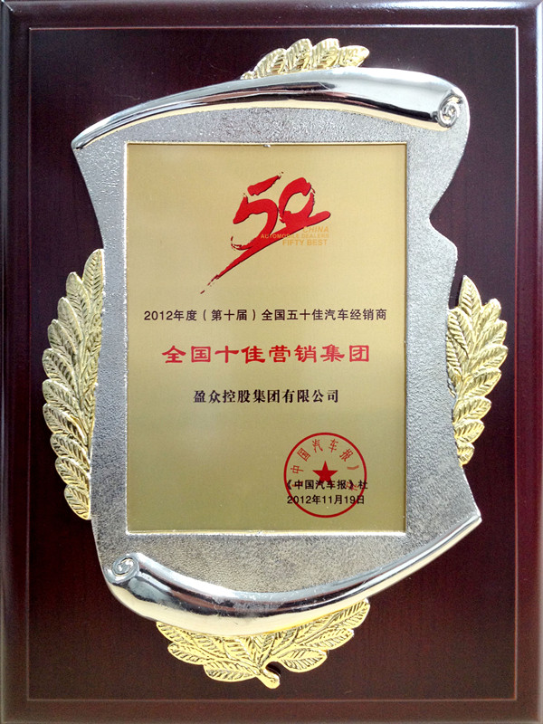 2012年,中國汽車市場增長放緩,汽車產業進入新一輪調整期。作為海西領先的汽車經銷商,盈眾汽車全體員工,精誠團結,艱苦奮斗,共同應對挑戰,以全方位出色的表現獲得了行業協會及媒體的認可和表彰,榮膺“全國十佳營銷集團”,并榮獲多項行業大獎。